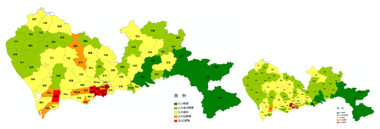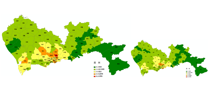 圖3 預(yù)計臺風(fēng)季工作日(左)、普通工作日(右)晚高峰全市主要街道交通運(yùn)行狀態(tài)圖