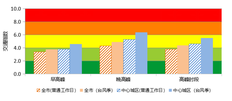 圖1 預(yù)計臺風(fēng)季工作日全市及中心城區(qū)交通指數(shù)與普通工作日對比