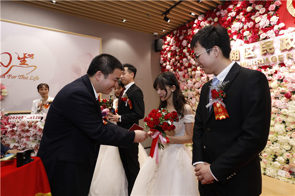 “我們是今年2月份在一起的,因?yàn)橐咔榈脑颍屛覀儽舜烁又馈湎а矍叭恕暮x,就像我在誓詞中說(shuō)的那樣,未來(lái)我會(huì)用盡一生來(lái)愛(ài)她,我也會(huì)對(duì)她誠(chéng)實(shí),對(duì)她的家人尊重和照顧就像對(duì)我的家人一樣,未來(lái)我們一定會(huì)健康地走下去。”在采訪(fǎng)中,肖先生說(shuō)道,選擇在“雙十二”結(jié)婚是因?yàn)榻衲晔翘貏e的一年,想在最后的一個(gè)月的雙數(shù)日子里領(lǐng)證,留下美好的回憶。