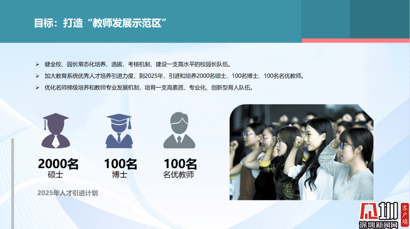 在人才隊(duì)伍方面,實(shí)施“領(lǐng)鷹工程”,建設(shè)一支高水平的校園長隊(duì)伍。優(yōu)化名師梯級培養(yǎng)和教師專業(yè)發(fā)展機(jī)制,培育一支高素質(zhì)、專業(yè)化、創(chuàng)新型育人隊(duì)伍。到2025年,羅湖將引進(jìn)和培養(yǎng)2000名碩士、100名博士、100名名優(yōu)教師,建立教科研博士工作站。