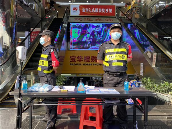 來到寶華樓門口,現(xiàn)場(chǎng)可見,出入口設(shè)置了體溫監(jiān)測(cè)器和免洗洗手液以及備用口罩等防疫物資,有相關(guān)人員在巡邏以及在監(jiān)督。區(qū)域內(nèi)的大部分商戶已正常營(yíng)業(yè),來往市民和商家也均戴好口罩,每家商戶也在顯眼位置擺放了必要的防疫物資。