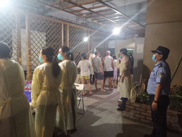 “我們已經(jīng)協(xié)調(diào)社康開始發(fā)號了,不要急,請耐心等待?!惫S崗社康外,一名民警正頂著烈日揮汗如雨,耐心地給居民進(jìn)行解釋,警服肩頸處可見一道道汗?jié)n。