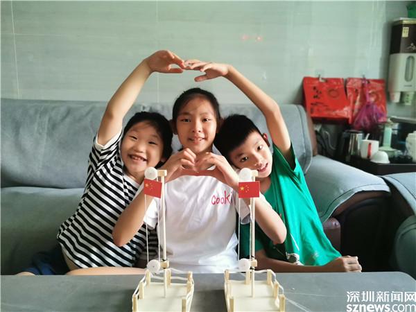 當(dāng)天下午,20位回答了問題的小朋友得到了獎(jiǎng)品,一個(gè)大大的工具包。他們要將工具包帶回家,自己動(dòng)手,拼裝一個(gè)五星紅旗升降臺(tái)。吳燕柔姐弟三人第一個(gè)完成,他們一起在家中舉行升旗儀式。姐姐慢慢搖動(dòng)升降臺(tái)的把手,三雙大眼睛盯著冉冉升起的五星紅旗,齊聲唱響了國(guó)歌。姐姐升完了弟弟再升,三人輪流一番,國(guó)歌也就一遍遍響起。意猶未盡之際,姐弟三人還比了一個(gè)大大的心,與自己親手制作的五星紅旗升降臺(tái)合影。