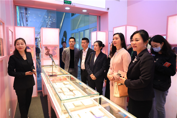 本次活動(dòng)中,人大代表們還走進(jìn)商場(chǎng)品牌門(mén)店、網(wǎng)紅店與消費(fèi)者互動(dòng)。代表們走進(jìn)周大生珠寶參股品牌大生美門(mén)店,被為大生美設(shè)計(jì)的星座極光大師系列作品所吸引目光。在翠綠門(mén)店,代表們對(duì)金箔制成的千里江山圖贊不絕口?!敖鸩谱鞒蓴?shù)米長(zhǎng)的畫(huà),這個(gè)工藝實(shí)在是高?!贝韨?cè)谝慌愿袊@道。