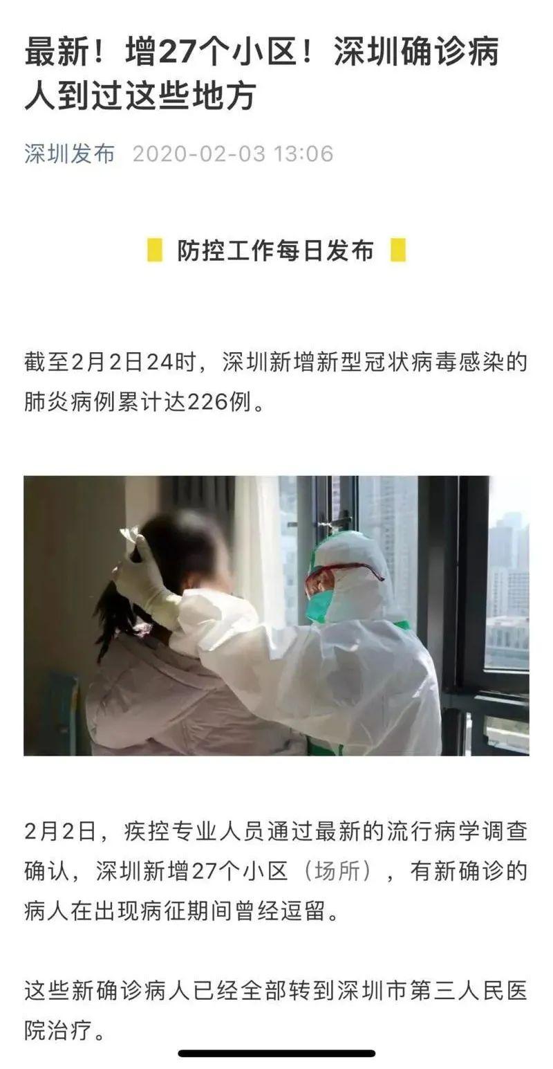 1月7日一早,深圳“1月7日新增2例新冠病毒陽性感染者”的消息,引起深圳市民的高度關注。與此同時,一條“深圳這27個新增小區(qū),新確診病人曾逗留過”的帖子,在微信朋友圈等社交網絡廣為傳播,眾多網友紛紛轉發(fā)。事實上,這條消息是2020年2月3日的“舊聞”,有關部門提醒廣大市民不要輕信,切勿因此引起恐慌。
