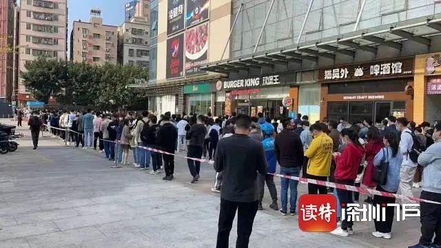 ▲布吉街道華潤萬象匯門口的核酸檢測點,來排隊做核酸檢測的人員有附近居民、騎手、小區(qū)保安等。