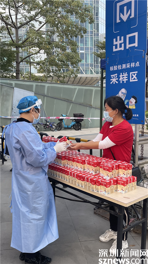 在筍崗街道初心公園核酸檢測(cè)點(diǎn),市民在進(jìn)行核酸檢測(cè)后可以去領(lǐng)取一瓶牛奶。據(jù)了解,這是深圳愛(ài)心企業(yè)專(zhuān)門(mén)為市民和醫(yī)護(hù)人員捐贈(zèng)的,這一瓶瓶牛奶在深圳的冬天向醫(yī)護(hù)人員和市民送上了一份溫暖。