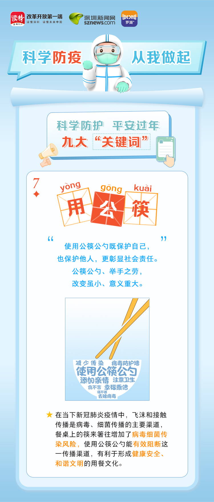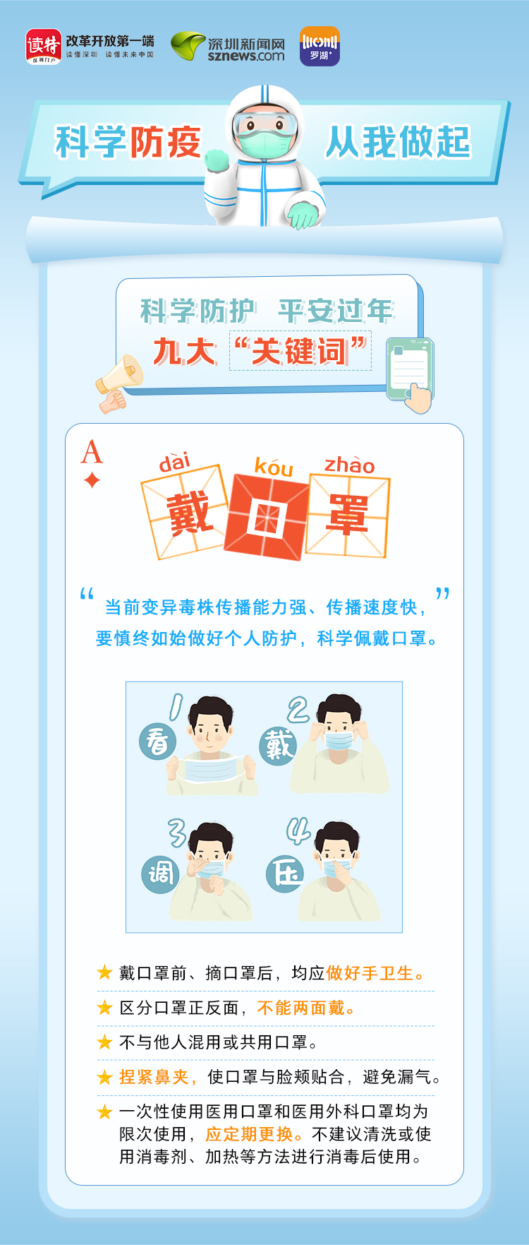 為更好地保護(hù)自己和他人的健康,度過一個祥和平安的春節(jié),請查收《科學(xué)防護(hù)平安過年九大“關(guān)鍵詞”》。在這場沒有硝煙的戰(zhàn)斗中,公安干警、醫(yī)護(hù)人員、社區(qū)工作者、志愿者始終堅守在一線,齊心協(xié)力、眾志成城抗擊疫情。讓我們攜手并進(jìn),共同抗疫,采用科學(xué)有效的方式做好自身防護(hù),不僅對自己負(fù)責(zé),更是對家人負(fù)責(zé),對社會負(fù)責(zé)。