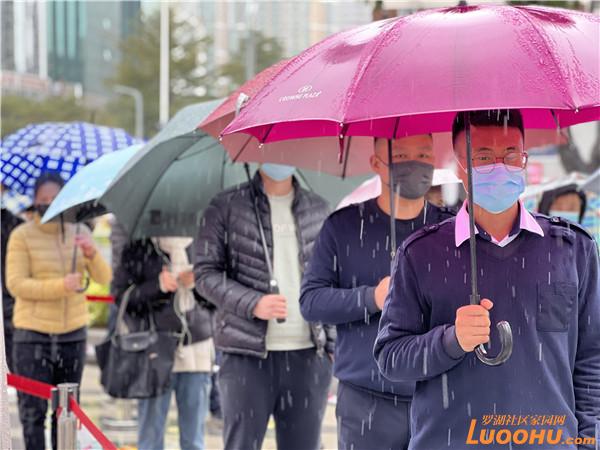 地上是淅瀝瀝的小雨,天氣惡劣,前來開展核酸檢測的市民依然遵守“一米距離”等防疫要求,現(xiàn)場井然有序。