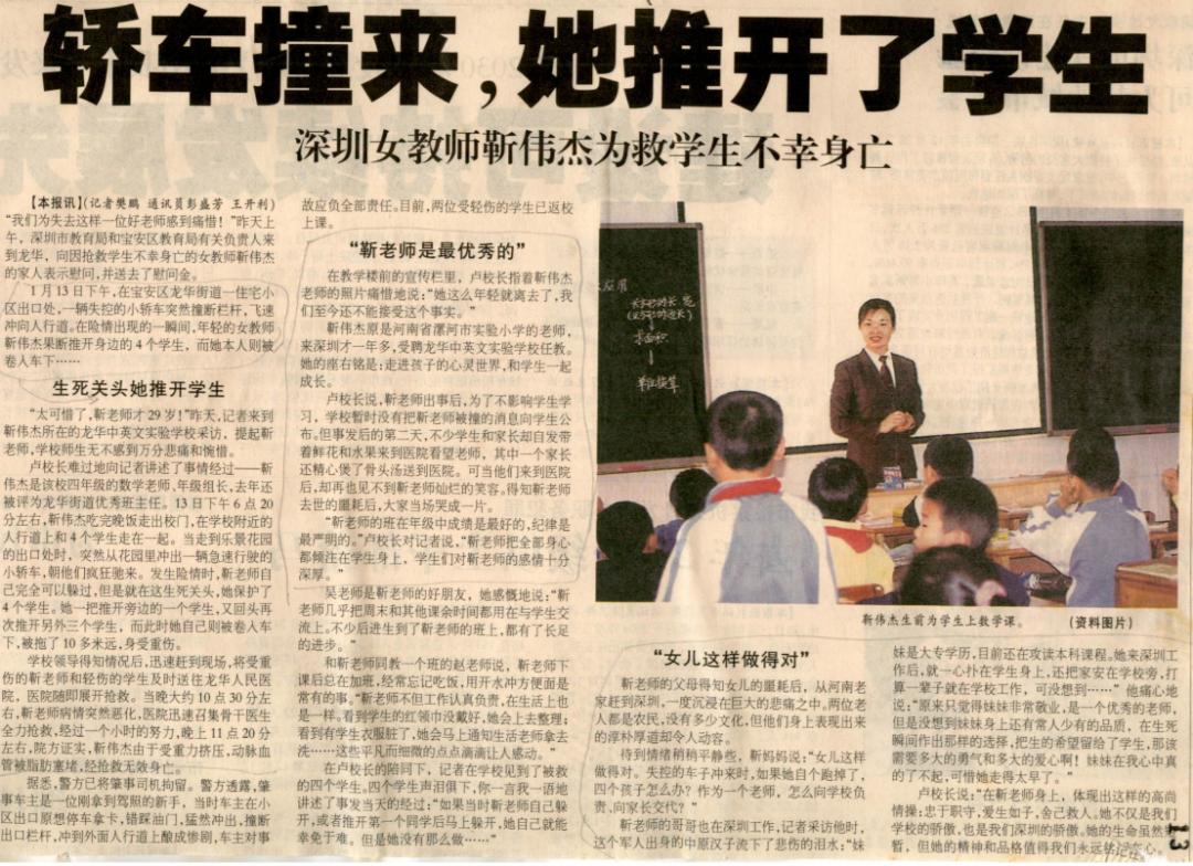 當(dāng)失控的汽車沖向她和4名學(xué)生時,年僅29歲的龍華中英文學(xué)校女教師靳偉杰把生的希望留給了學(xué)生,自己卻獻出了生命。