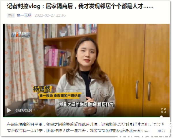 住在華瑞大廈A座封控區(qū)的第一現(xiàn)場記者楊語然,每天拍攝視頻記錄封控生活。在她的鏡頭下,封控區(qū)防疫工作有條不紊,民生服務(wù)暖心到位,鄰里之間抱團取暖、相互打氣。她表示,因為這段“特殊的”居家隔離時光,鄰里之間的關(guān)系反而迅速升溫,每天在微信群里互動,才知道住在一起的鄰居們那么多才多藝。