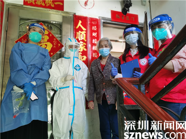 社工帶領(lǐng)醫(yī)護(hù)人員為高齡長(zhǎng)者上門進(jìn)行核酸檢測(cè)。