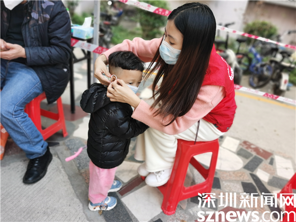 社工在核酸現(xiàn)場(chǎng)為沒有佩戴口罩的小朋友佩戴口罩。