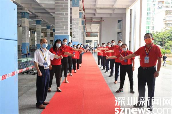 除了家長(zhǎng)的花式祝福外,老師們的加油行動(dòng)也是一道亮眼風(fēng)景線。羅湖翠園中學(xué)校長(zhǎng),高三年級(jí)主任身穿紅色送考服為考生加油。深圳市第一職業(yè)技術(shù)學(xué)校校領(lǐng)導(dǎo)和老師們?cè)诳忌亟?jīng)考場(chǎng)的路上,站成兩列縱隊(duì)等待著考生,當(dāng)考生經(jīng)過時(shí),老師們伸出手與考生擊掌,為考生加油。