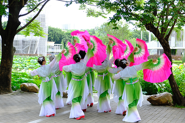 走進(jìn)公園,映入眼簾的是一望無際的荷葉。一陣微風(fēng)拂過,嫩綠的蓮蓬輕輕點(diǎn)頭,碩大的荷葉隨風(fēng)搖擺,讓人心曠神怡。荷塘邊,身著紅色連衣裙的阿姨們正隨著音樂舞動(dòng);池塘的另一頭,身著碧綠服裝的阿姨們熱情洋溢地表演著扇子舞。
