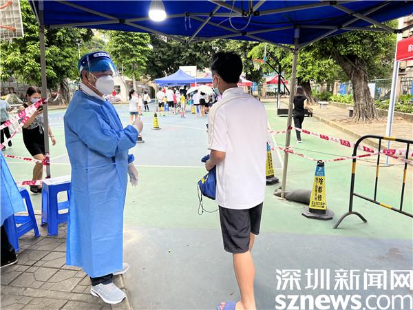 每到下午4點,羅湖區(qū)翠竹街道龍屋小區(qū)的籃球場上,都有陸陸續(xù)續(xù)迎來做核酸的居民,而李任平,則會提前半個小時到達(dá)現(xiàn)場準(zhǔn)備,每日如此,風(fēng)雨無阻。穿上防護(hù)服,戴上防護(hù)面罩,將“翠竹街道退役軍人”的臂章戴上,鮮紅的黨員徽章別在胸前,李任平就開始站在核酸檢測點卡口前,指引做核酸的居民掃碼、亮碼,維持秩序。