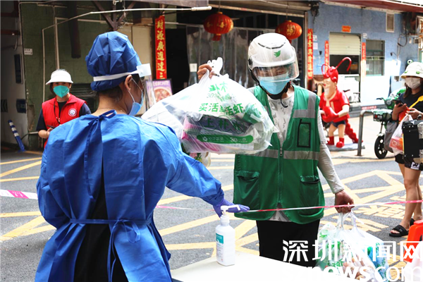 8月29日下午,深圳新聞網(wǎng)記者來(lái)到羅湖區(qū)南湖街道文錦社區(qū)凱悅?cè)A庭,只見(jiàn)小區(qū)居民正保持著一米距離有序地進(jìn)行核酸檢測(cè),身穿防護(hù)服的“藍(lán)墩墩”在一旁忙碌著。記者在現(xiàn)場(chǎng)看到偶有“騎士”將居民在網(wǎng)上商城所下單的物資像傳送接力棒一樣交到“藍(lán)墩墩”的手上,“藍(lán)墩墩”接過(guò)之后,立即進(jìn)行全方位的消殺工作。