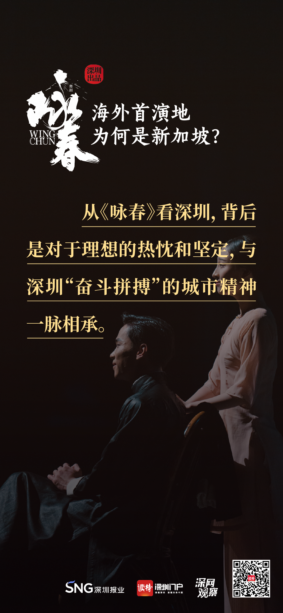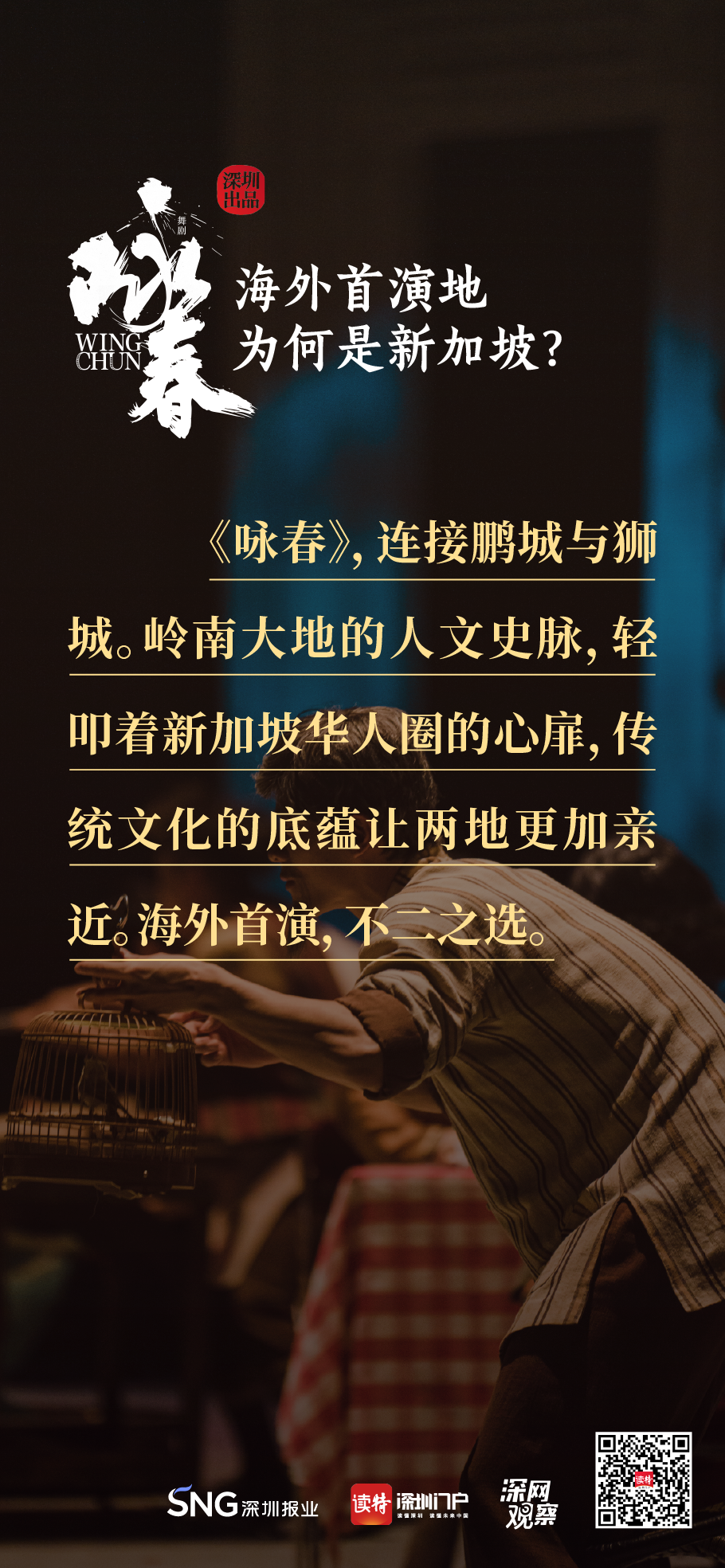《詠春》書(shū)寫(xiě)平凡英雄的傳奇,開(kāi)詠春的一扇門(mén),只為追尋心中的那一束光?!对伌骸?,連接鵬城與獅城,嶺南大地的人文史脈,輕叩著新加坡華人圈的心扉,傳統(tǒng)文化的底蘊(yùn)讓兩地更加親近,海外首演,不二之選。