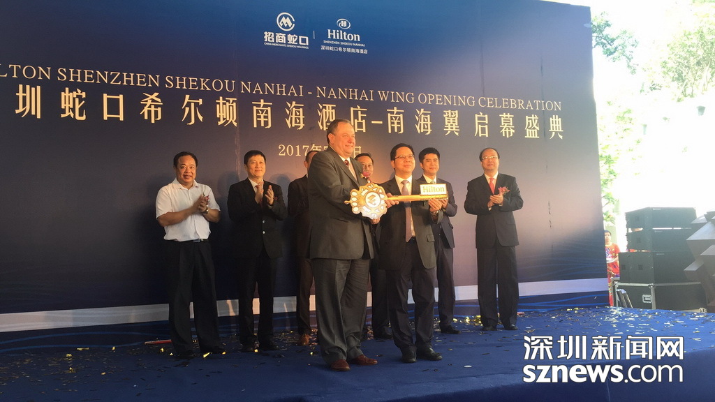 媒體發(fā)布會,招商蛇口代表將南海酒店鑰匙交接給希爾頓代表。