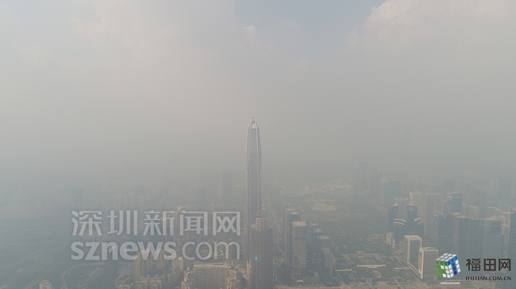 無人機(jī)在數(shù)百米高空俯瞰灰霾籠罩下的深圳中心區(qū),大半個(gè)城區(qū)都看不清楚。