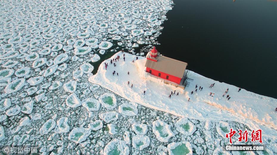 美國密歇根湖現(xiàn)冰雪奇觀 滿湖巨大圓冰似荷葉
