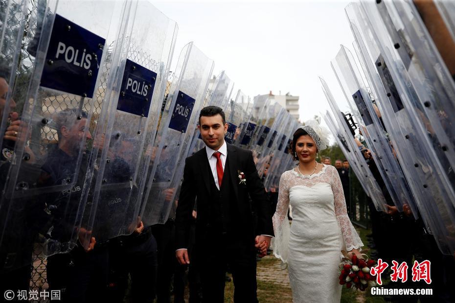 當(dāng)?shù)貢r間2018年3月21日,土耳其安塔利亞,警官Ceren Ekici和Taha YasinGul舉行婚禮。在10個月前的一次行動中,Taha YasinGul不慎開槍擊中Ceren Ekici的頭部,所幸沒有造成生命危險(xiǎn)。他們的婚禮由警局同事操辦,同事們舉著防彈盾牌,護(hù)送這對新人走向禮臺。圖片來源:視覺中國