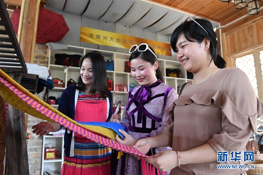 4月19日,在廣西南寧市青秀區(qū)南陽鎮(zhèn)施厚村古岳坡,游客在參觀用于制作民族工藝品的布料。今年“壯族三月三”假期期間,不少市民游客前往鄉(xiāng)村旅游觀光,激發(fā)了一股鄉(xiāng)村旅游小熱潮?!皦炎迦氯笔菑V西壯族自治區(qū)確定的法定假期。新華社記者陸波岸 攝