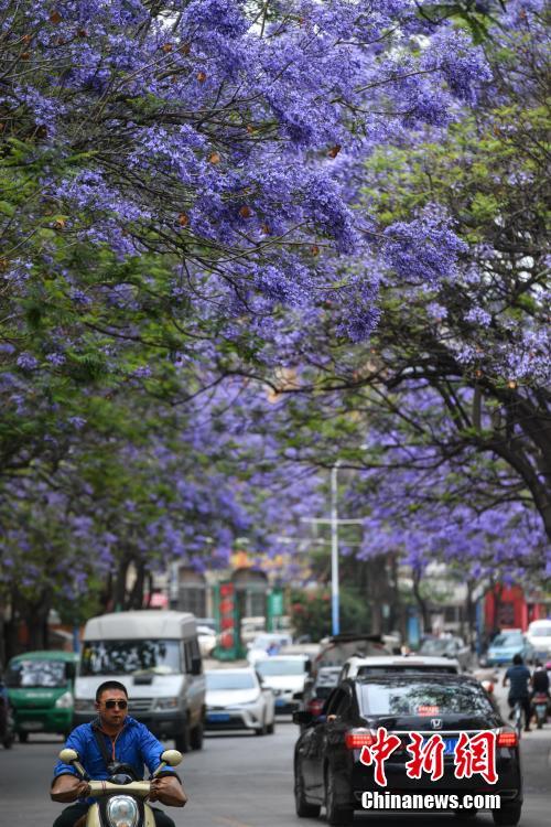 5月2日,昆明市區(qū)一道路兩旁的藍(lán)花楹盛開(kāi),車輛在“花街”穿行。 中新社記者 任東 攝