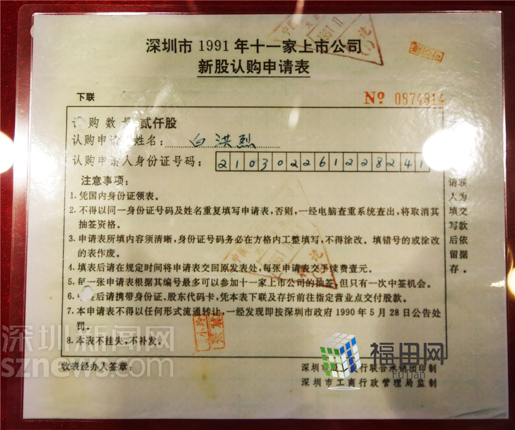 深圳1991年11家上市公司新股認(rèn)購申請表。