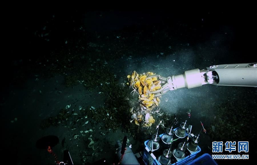 “深海勇士”號在“海馬冷泉”進行科學采樣的情景(5月20日攝)。新華社記者 張建松 攝