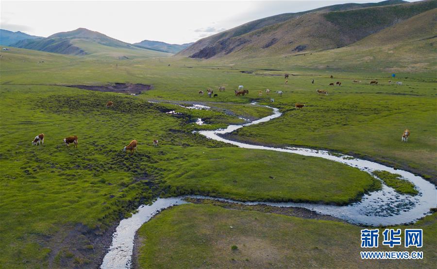 6月6日無人機(jī)拍攝的進(jìn)入全面返青期的內(nèi)蒙古赤峰市阿魯科爾沁草原。