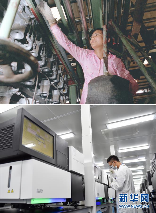 拼版照片:上圖為工人在位于深圳大鵬灣的一家染廠工作(資料照片,新華社記者楊紹明攝);下圖為2017年7月13日,工作人員在國家基因庫操作基因測序儀(新華社記者毛思倩攝)。建設(shè)于大鵬灣畔的深圳國家基因庫于2011年由國家發(fā)改委等部委批復(fù),2016年9月22日正式開業(yè)。新華社發(fā)