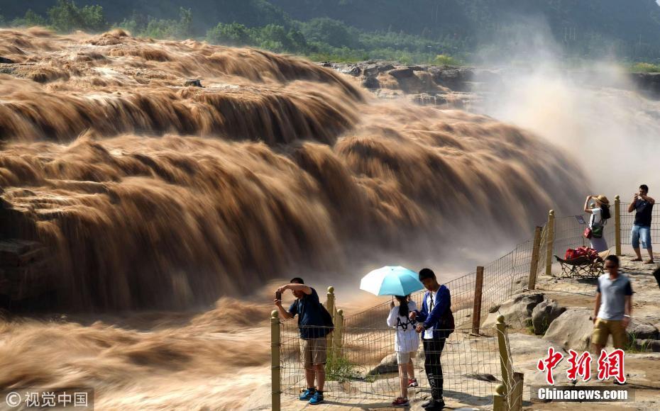 7月17日,山西臨汾,游客在黃河壺口瀑布游覽觀瀑。進(jìn)入7月主汛期,受黃河上游降雨量增多影響,位于山西吉縣和陜西宜川縣交界的黃河壺口瀑布水量暴漲。濁浪滔天的壯美瀑布群景觀,吸引了眾多游客。呂桂明攝 圖片來(lái)源:視覺(jué)中國(guó)