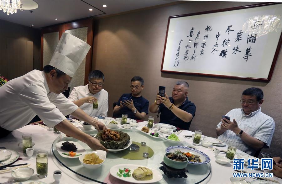 杭州酒家老板吳瑞康向記者介紹“叫化雞”的制作工序(6月16日攝)。 金庸在武俠小說《神雕俠侶》中借郭靖之口說過: “為國(guó)為民,俠之大者。”武俠精神在香港備受推崇,有其心向中華文化的情感基礎(chǔ)。在這個(gè)國(guó)際美食之都,品味舌尖上的武俠味,內(nèi)中的感覺別有深意。新華社記者 李鵬 攝