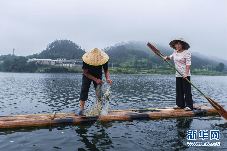 8月2日,淳安縣汾口鎮(zhèn)紅星村的漁民乘著竹排,在千島湖的支流武強溪上收網(wǎng)撈魚。新華社記者 徐昱 攝