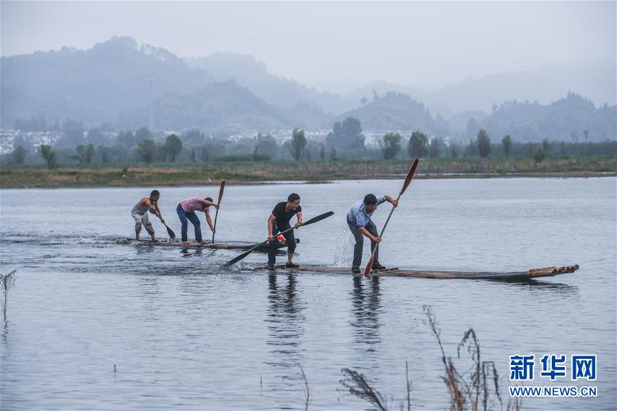 8月2日,淳安縣汾口鎮(zhèn)紅星村的漁民捕撈結(jié)束后,在千島湖的支流武強溪上進行劃竹排比賽。 新華社記者 徐昱 攝