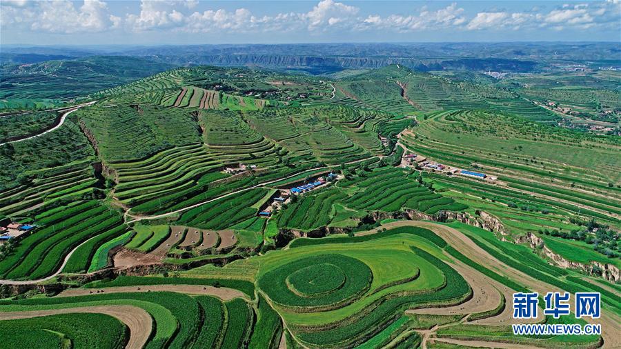 寧夏固原市彭陽縣金雞坪梯田公園(7月16日無人機(jī)拍攝)。新華社記者 王鵬 攝