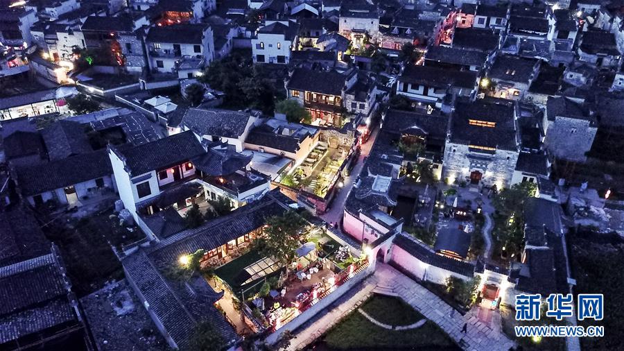 這是5月8日無人機拍攝的安徽黟縣宏村古民居夜景。