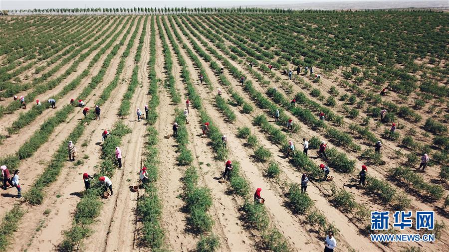 紅寺堡生態(tài)移民區(qū)的移民在百瑞源枸杞種植基地采摘頭茬枸杞(5月30日無人機(jī)拍攝)。近日,在寧夏吳忠市紅寺堡區(qū)百瑞源枸杞種植基地,頭茬枸杞迎來采摘收獲季。今年頭茬枸杞采摘期比往年提前20天左右。據(jù)了解,該基地地處紅寺堡生態(tài)移民區(qū),占地3000畝,采摘季節(jié)每天有數(shù)百名當(dāng)?shù)匾泼裨谔镩g采摘?jiǎng)谧?。新華社記者王鵬 攝