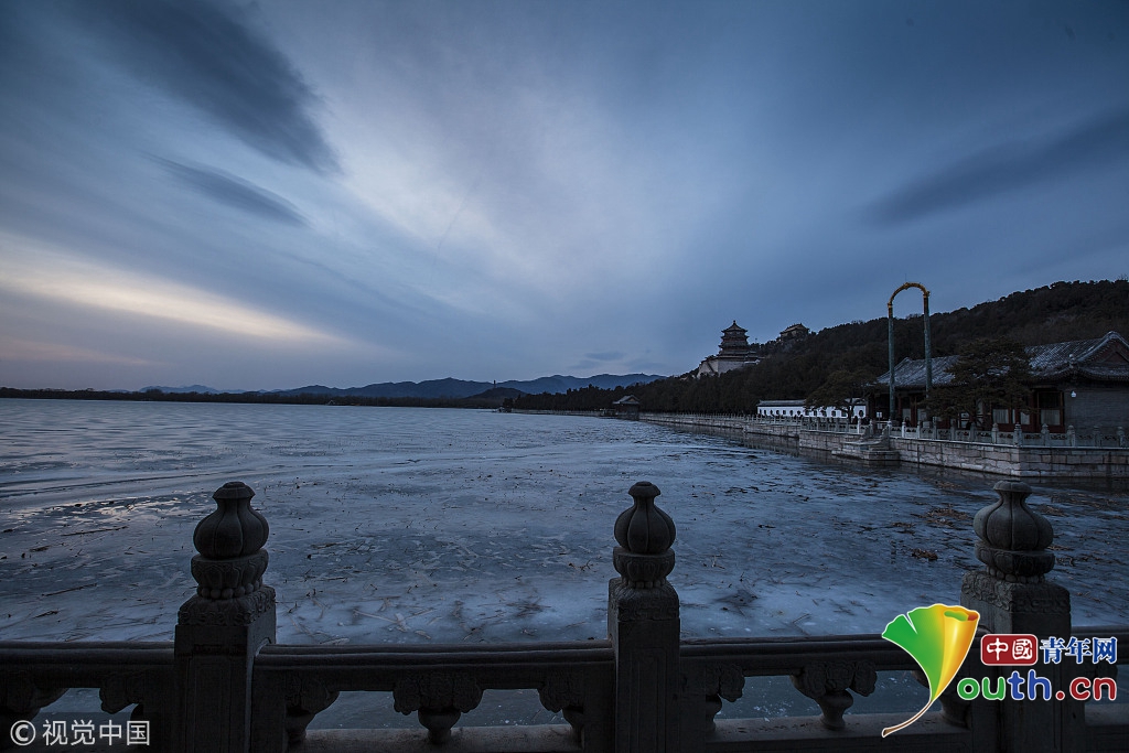 2018年2月23日,北京頤和園。當天日落時分昆明湖上空出現(xiàn)夕陽余暉的美景,夢幻般的色彩將古老的皇家園林裝扮得美輪美奐,讓人流連忘返。來源:視覺中國