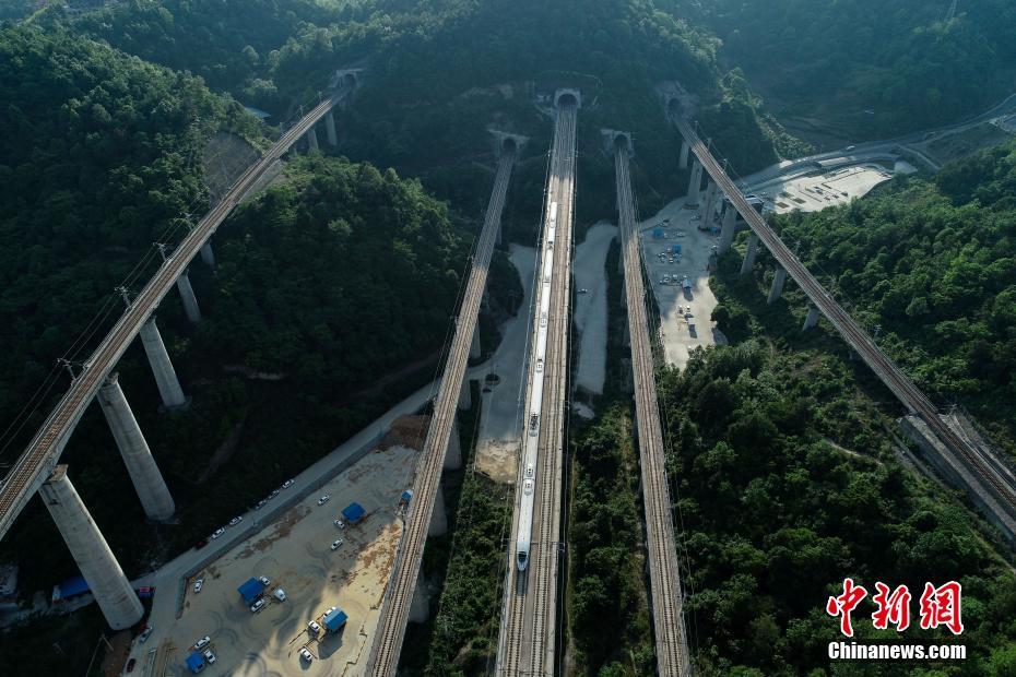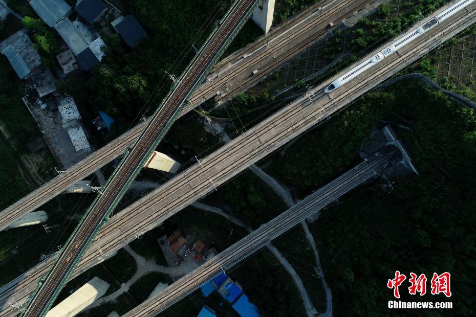 5月16日,一列動車從貴陽市郊交織的橋梁上駛過。貴州省地處中國西南腹地,高原山地居多,因此高鐵建設的橋隧占比較高。在貴陽市烏當區(qū)新添寨,高鐵滬昆線、貴廣客運專線、貴開城際客運專線的隧道和橋梁交織在一起,形成“五洞五橋”并行。中新社記者賀俊怡 攝