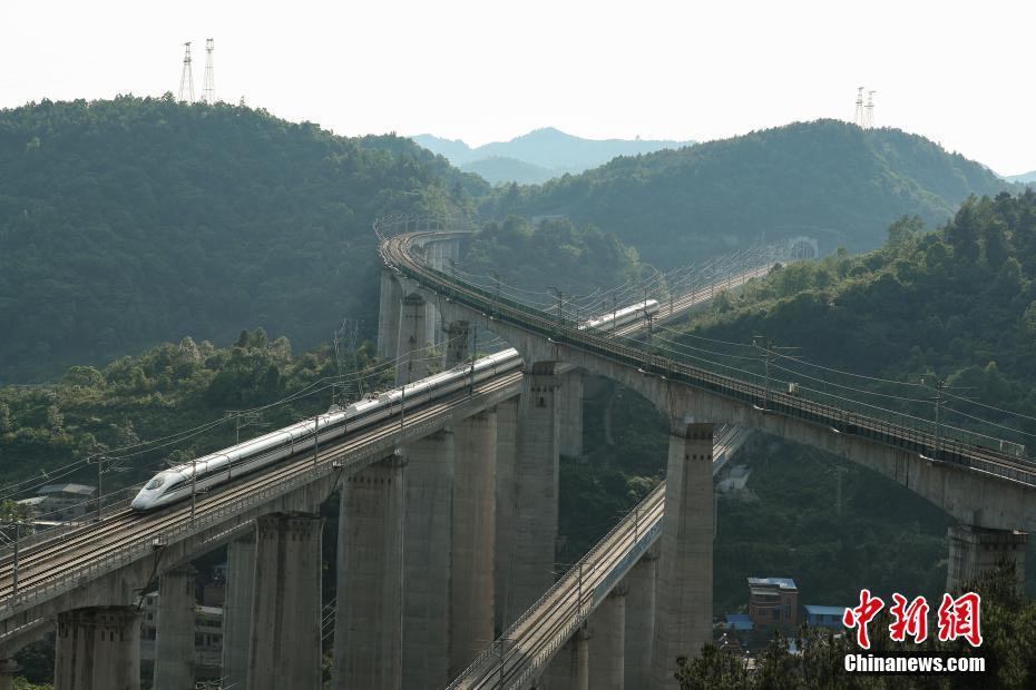 5月16日,一列動車從貴陽市郊交織的橋梁上駛過。貴州省地處中國西南腹地,高原山地居多,因此高鐵建設(shè)的橋隧占比較高。在貴陽市烏當(dāng)區(qū)新添寨,高鐵滬昆線、貴廣客運(yùn)專線、貴開城際客運(yùn)專線的隧道和橋梁交織在一起,形成“五洞五橋”并行。中新社記者賀俊怡 攝