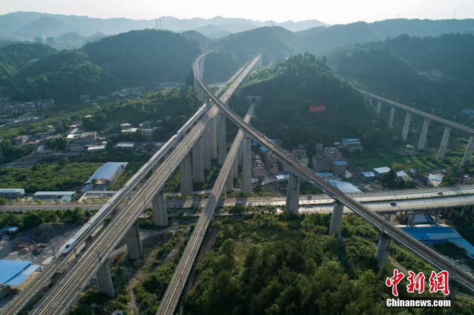 5月16日,航拍貴陽市郊交織的五條高鐵線路,一列動車駛出隧道。貴州省地處中國西南腹地,高原山地居多,因此高鐵建設(shè)的橋隧占比較高。在貴陽市烏當(dāng)區(qū)新添寨,高鐵滬昆線、貴廣客運(yùn)專線、貴開城際客運(yùn)專線的隧道和橋梁交織在一起,形成“五洞五橋”并行。中新社記者賀俊怡 攝