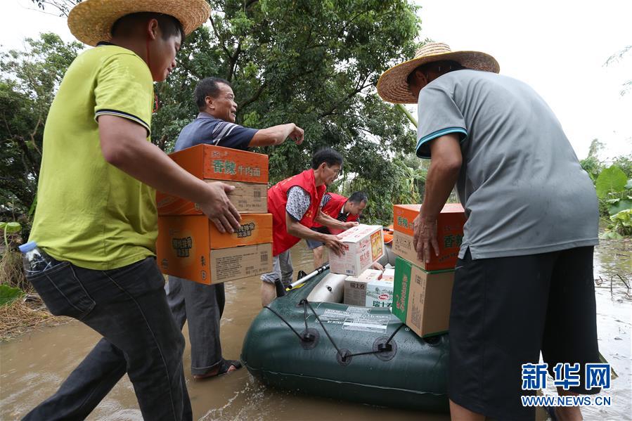 9月18日,在廣東省陽江市陽春市,人們把食物搬運(yùn)到筏子上,準(zhǔn)備分發(fā)給受困村民。 新華社記者張加揚(yáng)攝