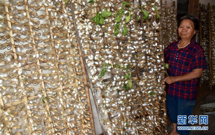 9月18日,在廣東省陽江市陽春市陂面鎮(zhèn),村民謝芳英在收拾從水中撈上來的蠶繭。 新華社記者 周科 攝