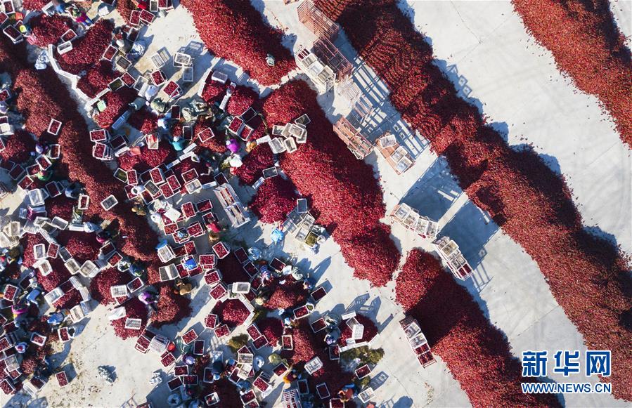 秋收時(shí)節(jié),吉林省白城市通榆縣的辣椒迎來豐收?;鸺t的辣椒和勞作的農(nóng)民構(gòu)成一幅幅美麗的豐收圖景。