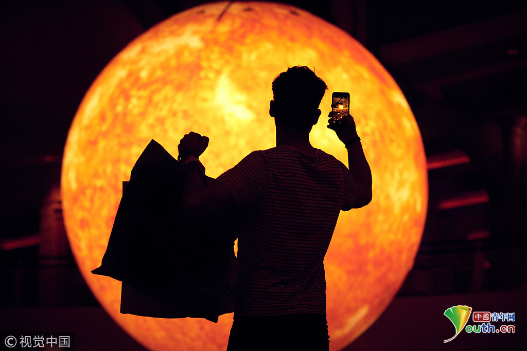 當(dāng)?shù)貢r間2018年9月18日,英國曼切斯特,顧客們在特拉福德購物中心的一個巨型的“太陽”下享受室內(nèi)日光浴,感受英國未完的史上最熱夏天。這個人造“太陽”的亮度相當(dāng)于1.2萬個燈泡。圖片來源:視覺中國