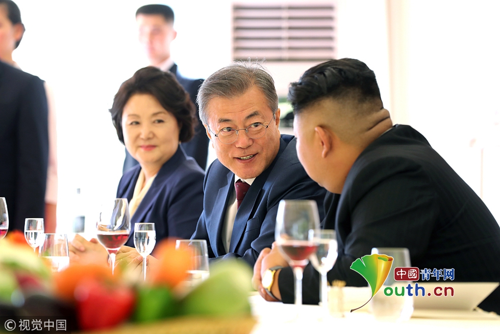 當(dāng)?shù)貢r(shí)間2018年9月20日,朝鮮,韓國(guó)總統(tǒng)文在寅在三池淵招待所和金正恩夫婦一起共進(jìn)午餐。圖片作者:Yonhap News Agency/視覺中國(guó)