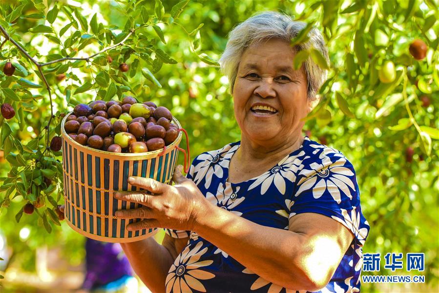 9月22日,河北省棗強縣棗強鎮(zhèn)孟家莊村的棗農(nóng)在展示剛剛收獲的紅棗。 近日,河北省棗強縣的2000多畝棗園迎來收獲季,棗農(nóng)們搶抓農(nóng)時,采摘、篩選、晾曬紅棗,樂享秋收的快樂。 新華社記者李曉果攝