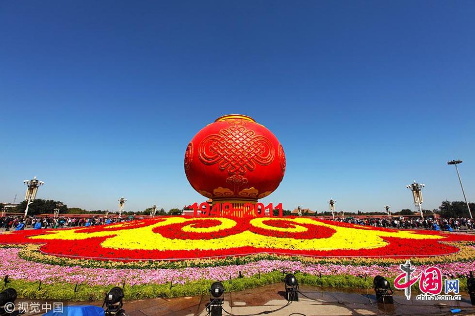 2011年10月04日,在北京蔚藍(lán)的天空下,“祝福祖國(guó)”的大型花壇屹立在天安門(mén)廣場(chǎng)中央。蘇陽(yáng)攝影